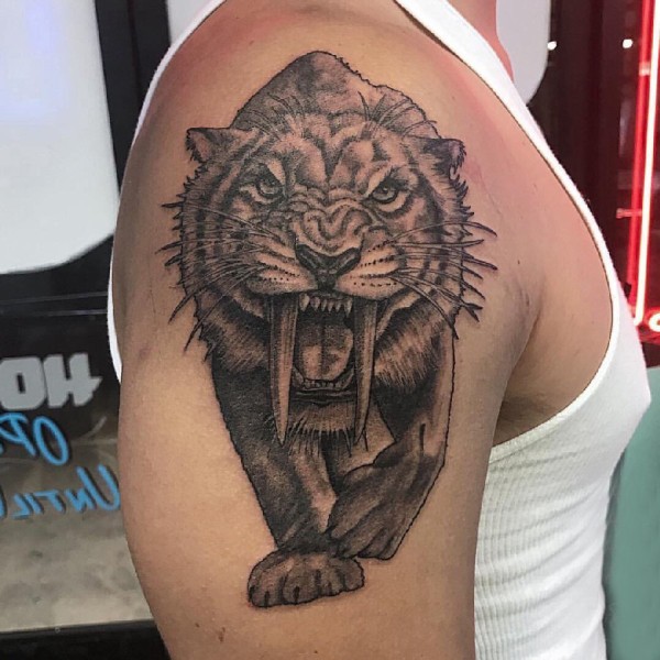 老虎图腾纹身 男生大臂上黑色的剑齿虎纹身图片