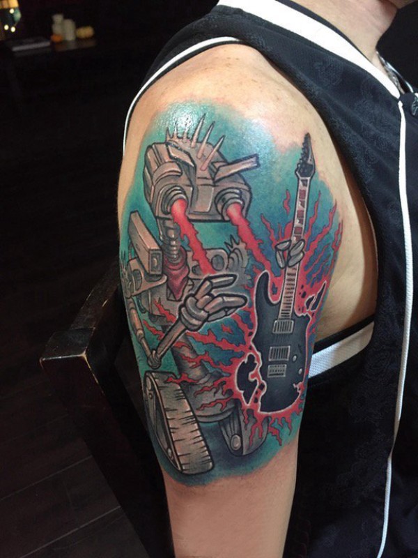 机器人纹身 男生大臂上吉他和机器人纹身图片