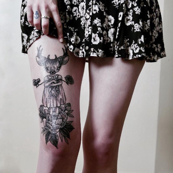大腿纹身传统 女生大腿上黑色的花朵和鹿纹身图片