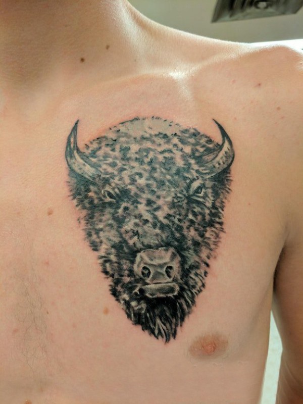 公牛头纹身 男生胸部黑色的牛头纹身图片