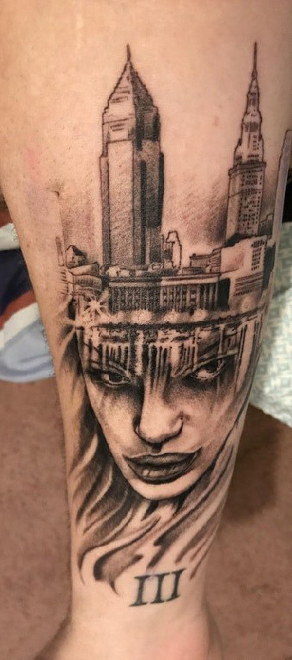 欧美小腿纹身 男生小腿上建筑物和人物肖像纹身图片