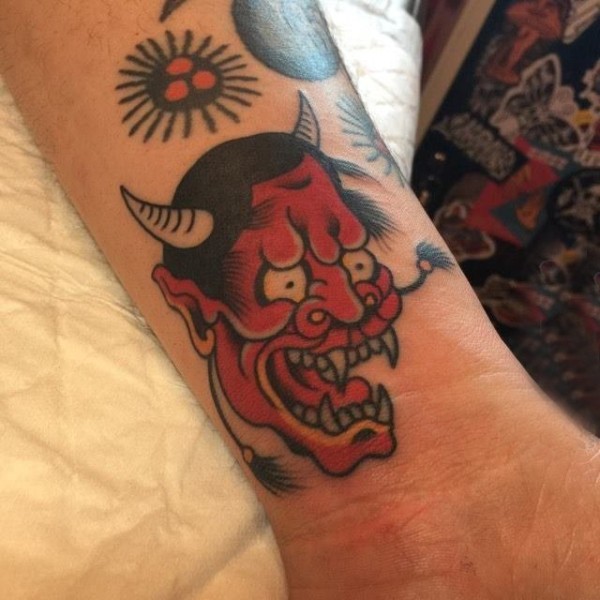 般若面具纹身 男生手腕上彩色的般若纹身图片