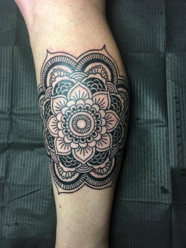 曼陀罗图案纹身 男生小腿上黑色的曼陀罗纹身图片