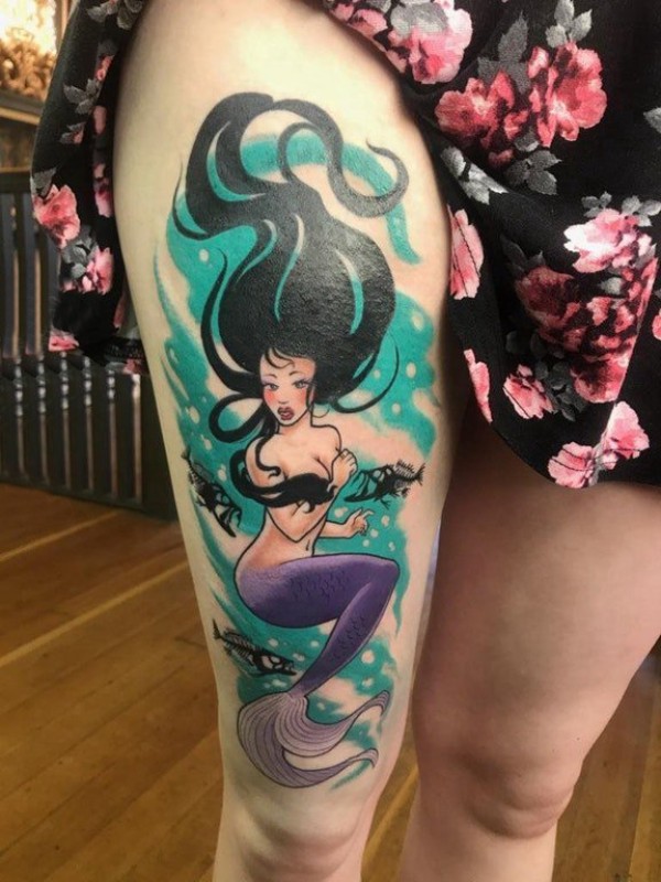 大腿纹身传统 女生大腿上彩绘的美人鱼纹身图片