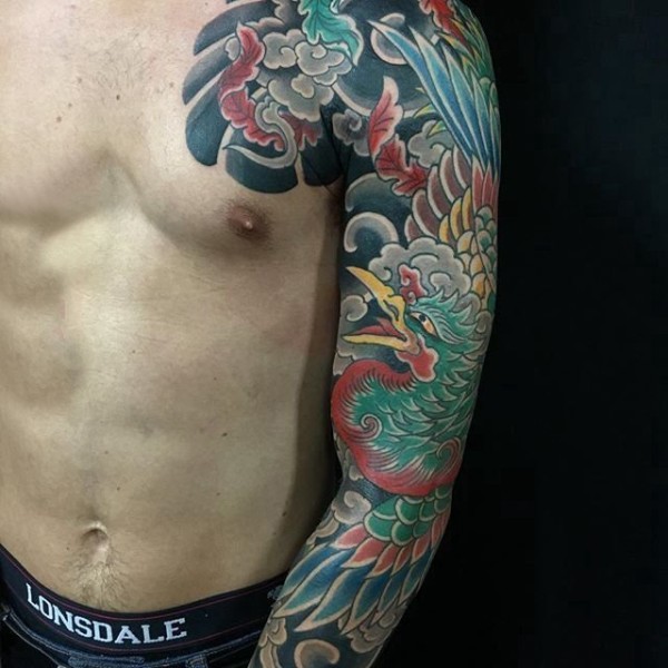 日本纹身 男生手臂上彩色的花臂纹身图片