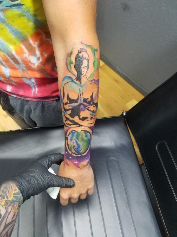 人物肖像纹身 男生手臂上地球和人物肖像纹身图片