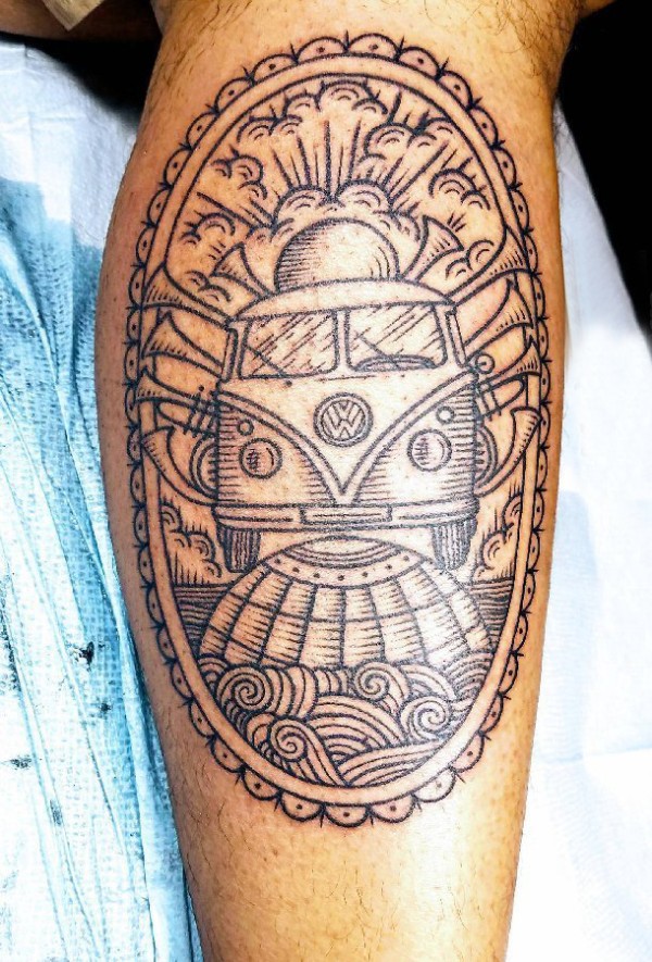 汽车纹身 男生小腿上黑色的汽车纹身图片