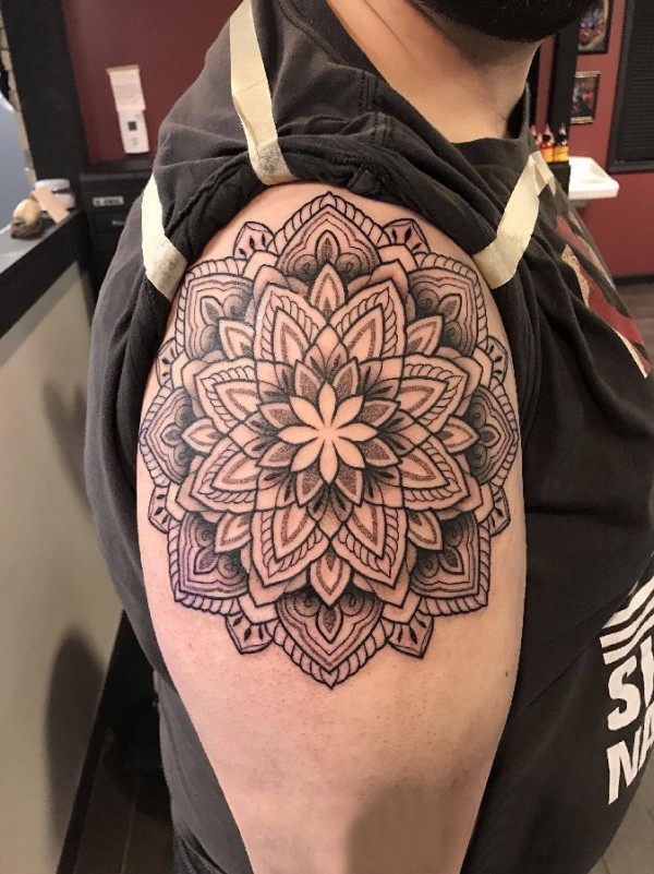 曼陀罗图案纹身 男生大臂上黑色的曼陀罗纹身图片