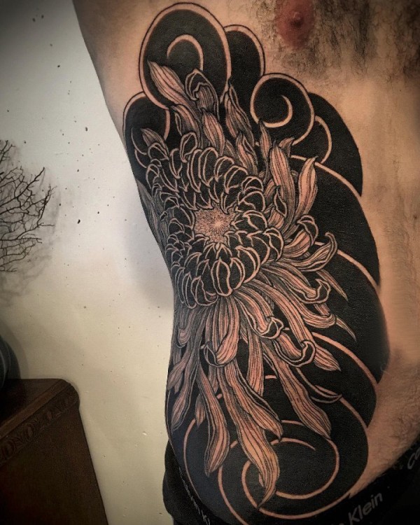 黑灰菊花纹身 男生侧肋上黑灰菊花纹身图片