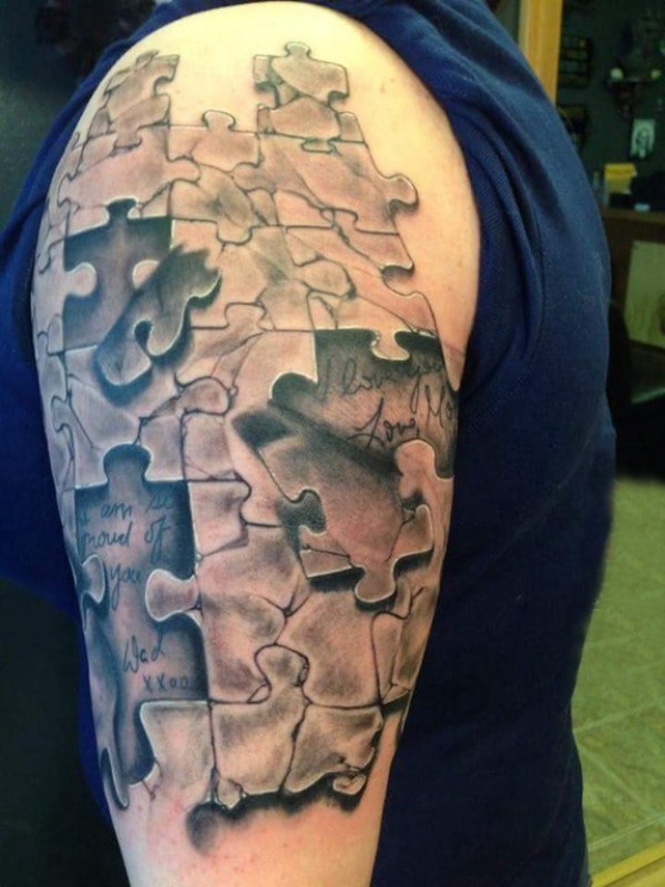 欧美拼图纹身 男生大臂上黑色的拼图纹身图片