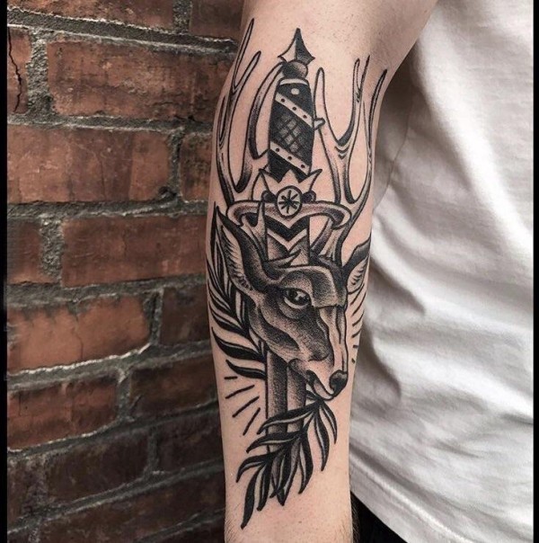 欧美匕首纹身 男生手臂上欧美匕首纹身和鹿头纹身图片