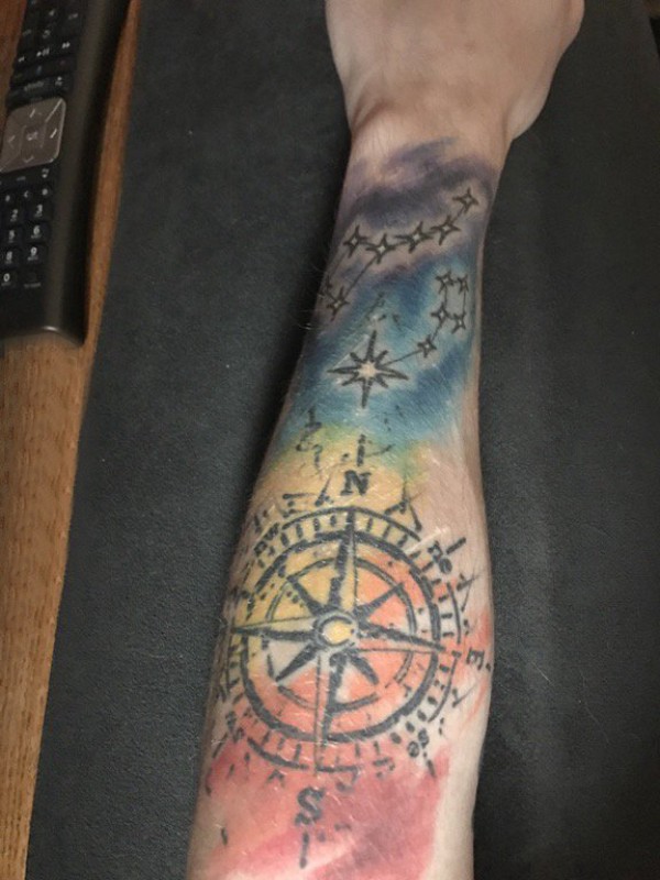 手臂纹身素材 男生手臂上彩色的指南针纹身图片