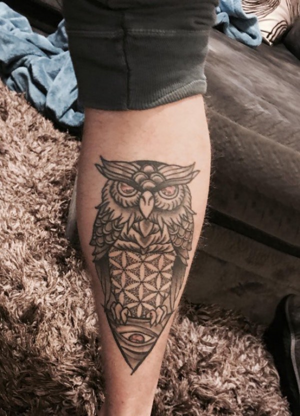 百乐动物纹身 男生小腿上黑色的猫头鹰纹身图片