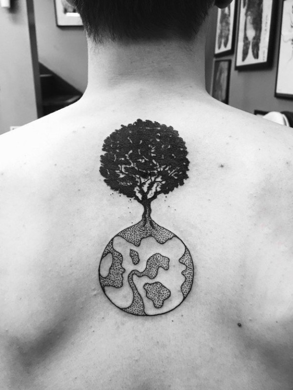 地球纹身图案 男生背部树纹身和地球纹身图案