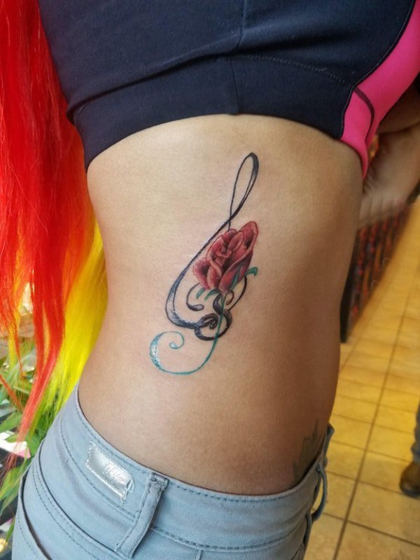 侧腰纹身图 女生侧腰上音符和玫瑰纹身图片