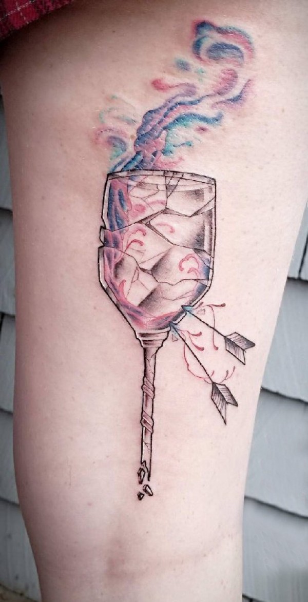 大腿纹身图女 女生大腿上彩色的酒杯纹身图片