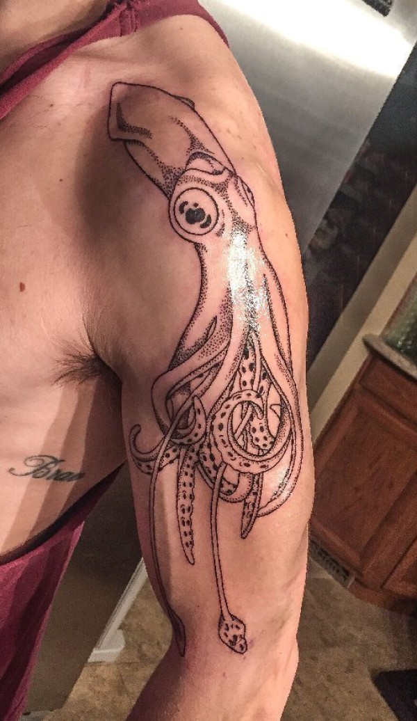 百乐动物纹身 男生手臂上黑色的鱿鱼纹身图片