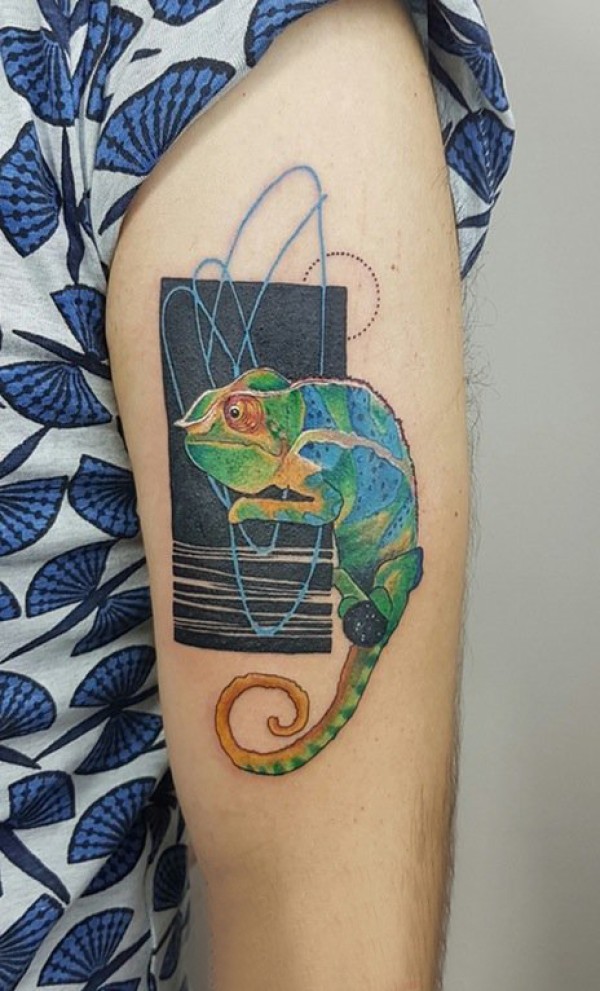百乐动物纹身 男生手臂上彩色的变色龙纹身图片
