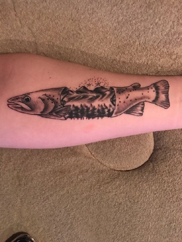 手臂纹身素材 男生手臂上黑色的鱼纹身图片