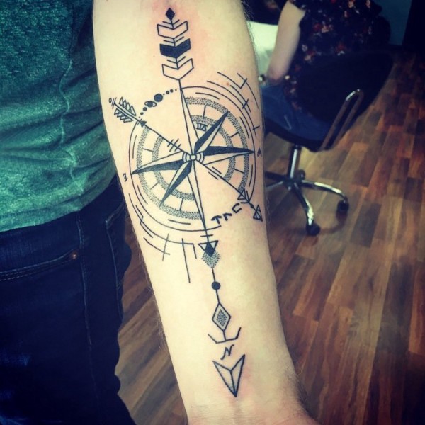手臂纹身素材 男生手臂上黑色的指南针纹身图片