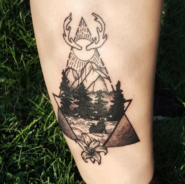 山水纹身图案 男生小腿上简单线条纹身山水纹身图案