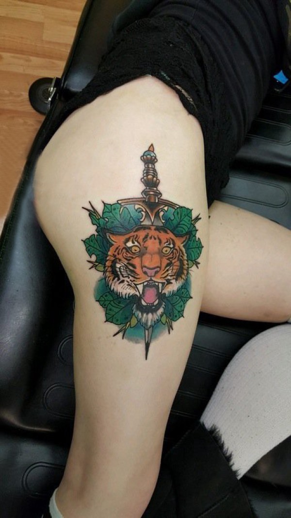 老虎图腾纹身 女生大腿上老虎图腾纹身和匕首纹身图片