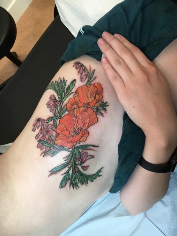 彩色花朵纹身图案 男生侧肋上彩色花朵纹身图案