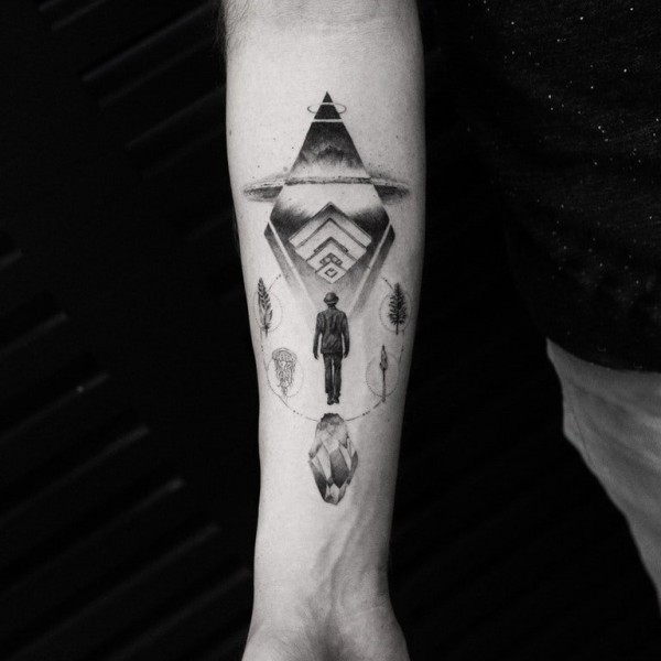 手臂纹身素材 男生手臂上人物和飞碟纹身图片