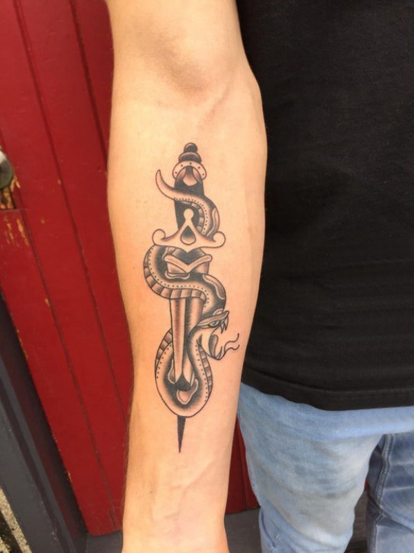 手臂纹身图片 男生手臂上匕首和蛇纹身图片