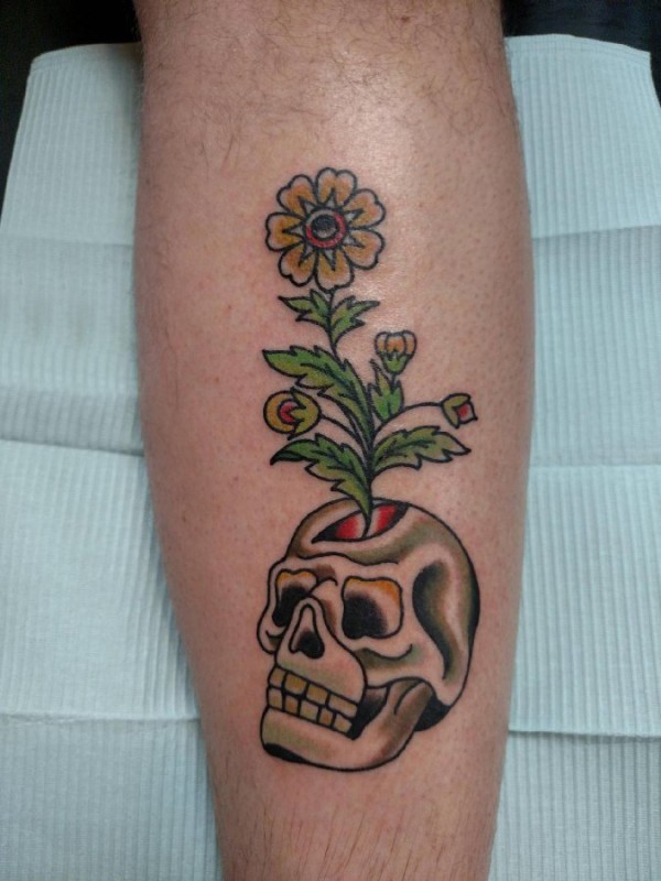 骷髅小腿纹身 男生小腿上骷髅和花朵纹身图片