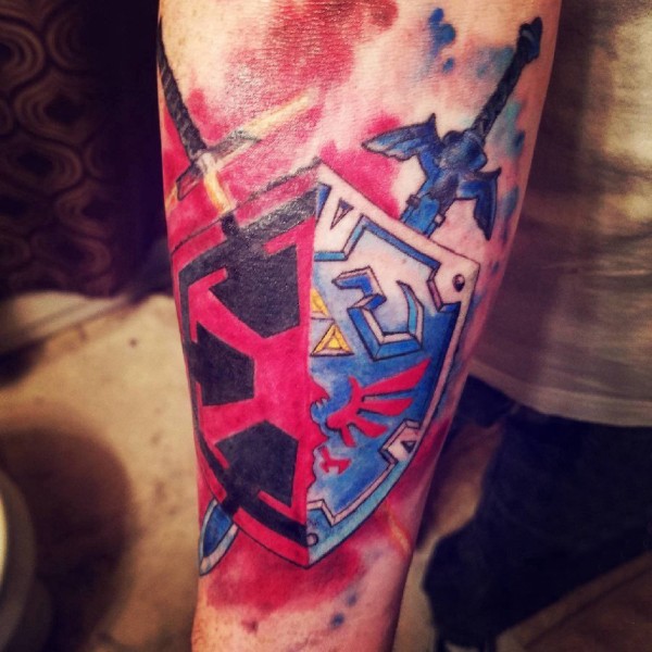 手臂纹身图片 男生手臂上彩色的盾牌纹身图片