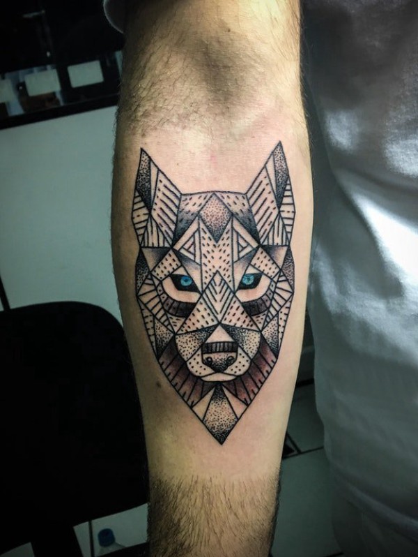 手臂纹身素材 男生手臂上黑色的几何狼纹身图片