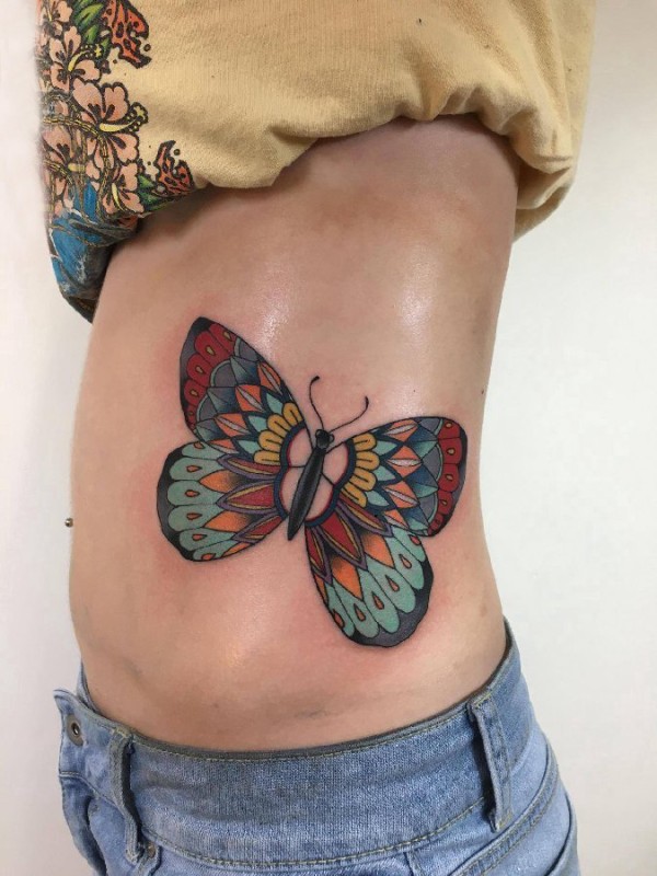 百乐动物纹身 女生侧腰上彩色的蝴蝶纹身图片