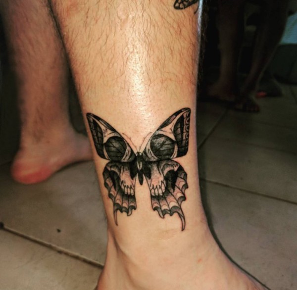 3d蝴蝶纹身 男生小腿上蝴蝶和骷髅纹身图片