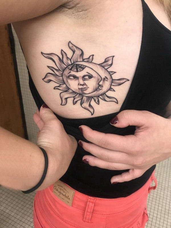 太阳图腾纹身 女生侧肋上太阳图腾纹身黑灰图片