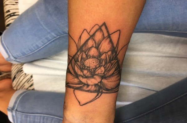 睡莲花纹身 女生手臂上黑色三角形和莲花纹身图片