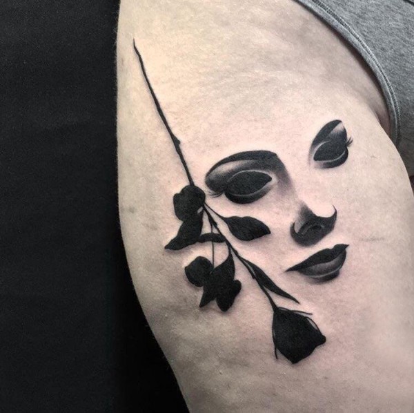双大臂纹身 男生大臂上人物肖像和玫瑰纹身图片