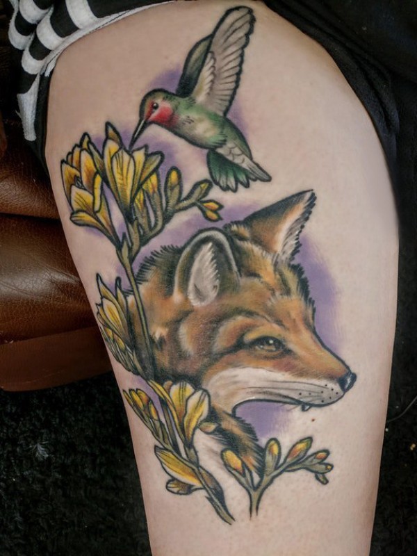 彩色狐狸纹身 女生大腿上彩色狐狸纹身花朵图片