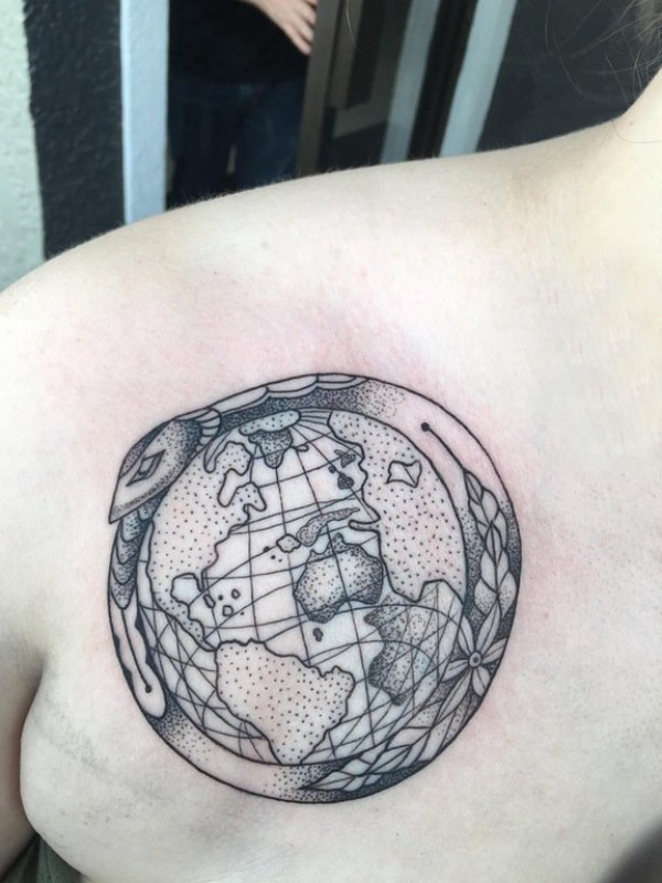 地球纹身图案 女生肩部黑色的地球纹身图片