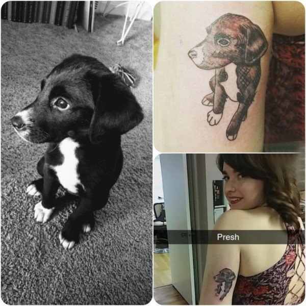 纹身动物 女生大臂上黑色的小狗纹身图片
