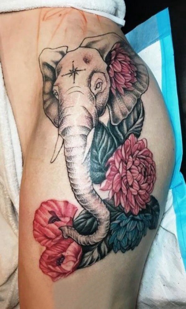 纹身大象图案 女生大腿上彩绘纹身大象图案