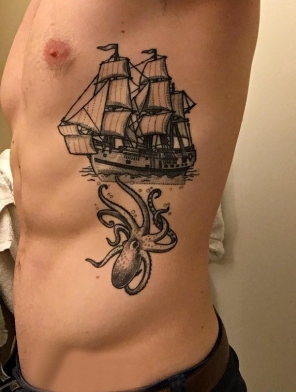 纹身侧腰男 男生侧腰上章鱼和帆船纹身图片