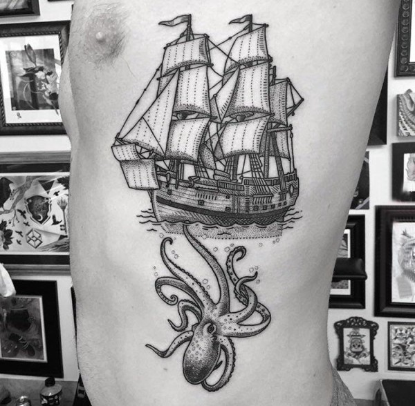 纹身侧腰男 男生侧腰上帆船和章鱼纹身图片