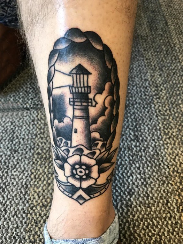 纹身灯塔 男生小腿上黑灰纹身灯塔图片