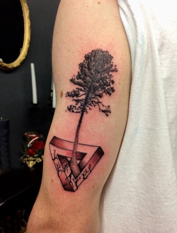 手臂纹身素材 男生手臂上大树和三角形纹身图片