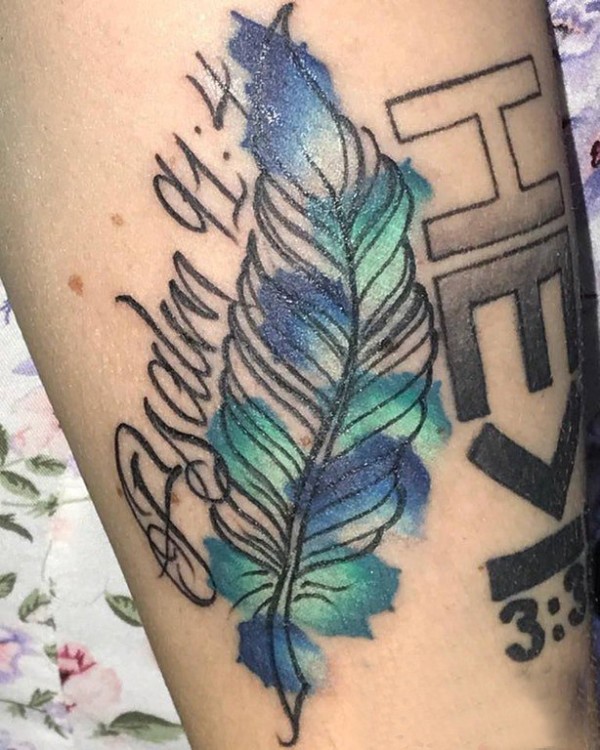 彩绘纹身 女生大腿上彩色的羽毛纹身图片
