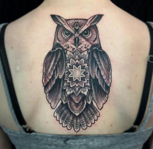 百乐动物纹身 女生后背上黑色的猫头鹰纹身图片
