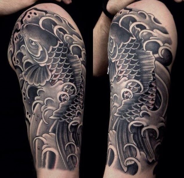 纹身鲤鱼 男生手臂上黑灰纹身鲤鱼图片