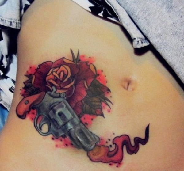 女生时尚腹部手枪图案纹身