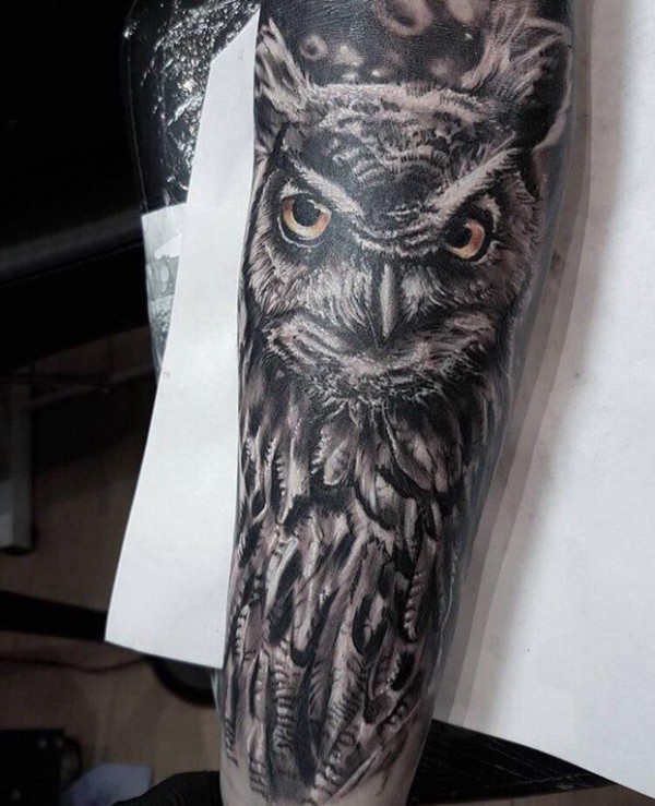 纹身猫头鹰 男生手臂上黑灰纹身猫头鹰图片